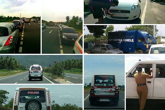 After my Onam holidays, I was travelling back to Bangalore. From Kollam I stopped at the toll gate over Madurai bypass. A polite lady Police Constable of Tamil Nadu Police noticing my Karnataka registered car advised me to park aside and said that I shall be escorted by Police in the wake of recent #Cauvery unrest. For me it didn't make sense what she said. Escort a common citizen on the highway by the Police!!?? I parked aside; soon 2 more KA registered cars joined and the motorcade from Madurai started at 10:00am.