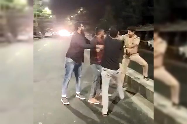 The video shows four men beating a police constable in uniform in the middle of a road, as vehicles pass by. Heavy blows are rained on the policeman as he frantically tries to block them to save himself from bruises. While one of the four men moved away only to return and beat the policeman, another man walks towards the camera and pushes it down.