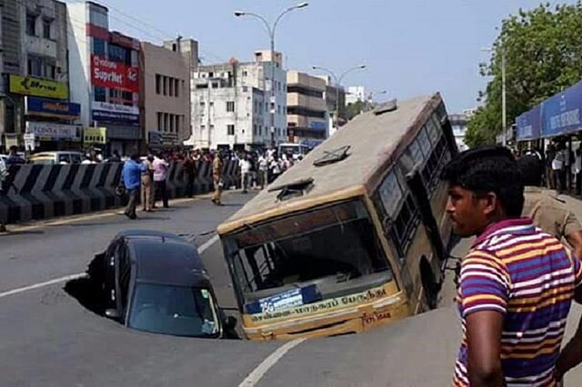 In December 2015, a giant crater was formed along the Anna Salai-Vijayaraghava Road in Teynampet. On that occasion to, the road cave-in was blamed on the metro construction.