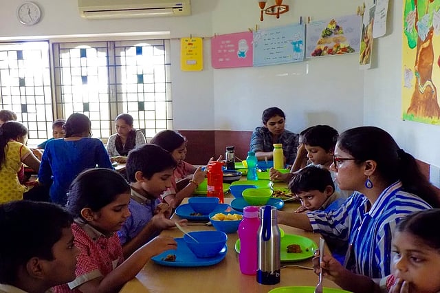 From October 2016, the school decided to serve 100% vegan meals and avoid using animal products on campus. The children have three meals in school -- breakfast, lunch, and evening snack.