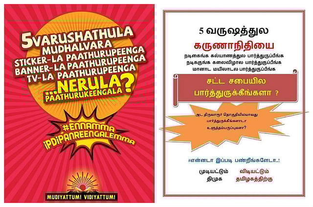 On Tuesday morning, several Tamil and English newspapers in Chennai screamed these lines out from full-page ads, put out by the DMK with their 2016 clarion call – ‘Mudiyattum Vidiyattum’ (Let this regime end, let there be new dawn).