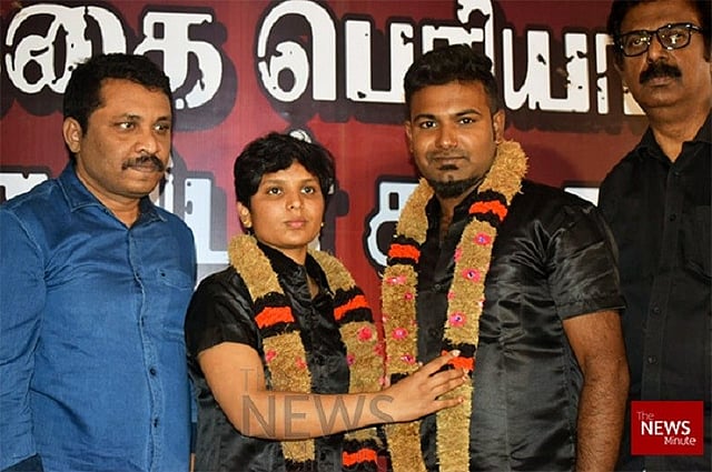 “We, Gowsalya and Sakthi, agree in front of you all, that we are life partners.” As the head office of the Thanthai Periyar Dravidar Kazhagam reverberated with this statement, activist and anti-caste crusader Gowsalya and Parai artiste Sakthi married each other in the presence of the leaders of the Dravidian outfit, chief of the NGO Evidence, Sakthi’s family and close friends.
