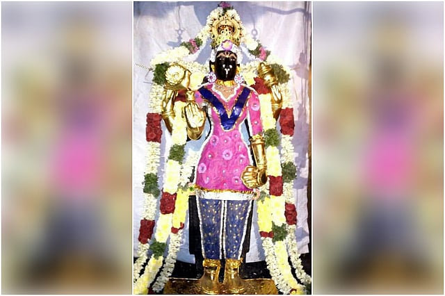 The deity is adorned with sandalwood paste (sandhanakaapu) on Fridays. Only this time, going against the traditional saree, Raj decided to dress the goddess in salwar-kameez-dupatta, “The priest made a different pattern with the glitter paper used generally to dress her in a saree,” explains Ganeshan.