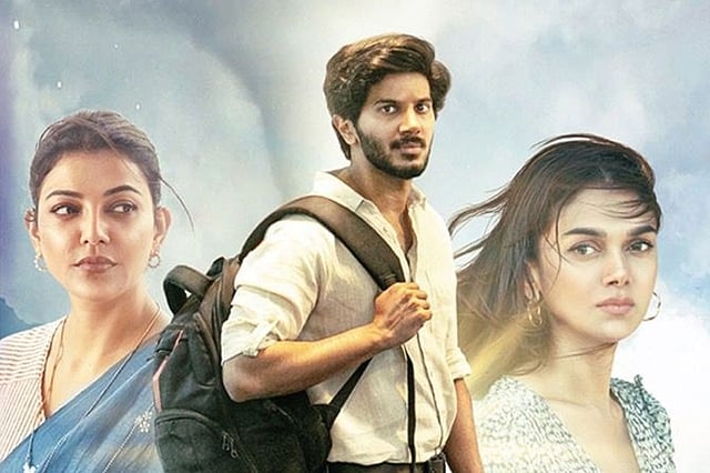 With that warning out of the way, let’s dive into our review of Tamil cinema’s latest romantic comedy starring Dulquer Salmaan (Yazhan), Aditi Rao Hydari (Mouna) and Kajal Aggarwal (Malarvizhi). The breezy movie begins with a literal storm when Yazhan and Mouna meet at a seaside restaurant. For a change, the heroine saves the hero, taking him to safety as strong winds threaten to blow them away.