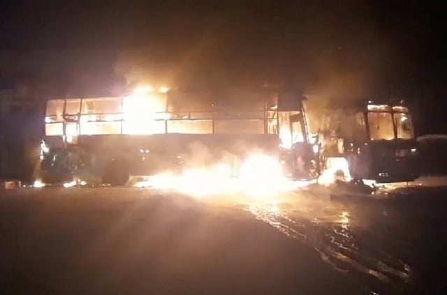 The impact of the collision caused sparks and the bus caught fire. The flames engulfed the vehicle, charring four persons to death on the spot. Several others were injured.