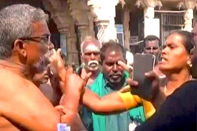 An enraged Ayyakannu immediately uses a Tamil cuss word implying she is a slut. The woman retaliates and slaps Ayyakannu. Pandemonium ensues with the other men in Ayyakannu's group and the two BJP members shouting at each other. In the next few seconds, there is much commotion and the woman can be seen pushed at least twice. She then removes the slipper on her feet and threatens the men. Temple authorities intervene, and speak to both groups.