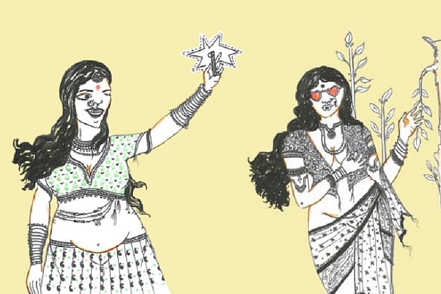 The voluptuous women in the illustrations are the work of Somdutt Sarkar, who tweets at @bongbelly. The images are also 'traditional' with elements of technology in them (hence selfies, tinder on the cell phone, the laptop, the tattoo on the woman's breast saying Rahul etc.)