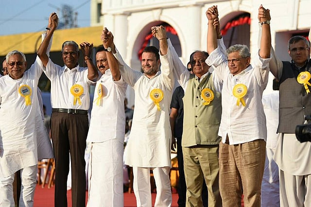 The music however abruptly stops when the leaders walk up to stage. The titans of the opposition parties, with Stalin at the centre, walk up to the edge of the platform and raise their intertwined hands together. Stalin then proceeds to sit in the middle of a row filled with his guests, while his half-sister and DMK MP Kanimozhi was relegated to the back row along with TR Baalu. Dayanadhi Maran, meanwhile, was forced to crane his neck up to the stage of leaders, as he was seated in a section near the rest of the audience. Who was really the centre of attention at this diamond jubilee celebration of Kalaignar's political journey, could not have been any clearer.