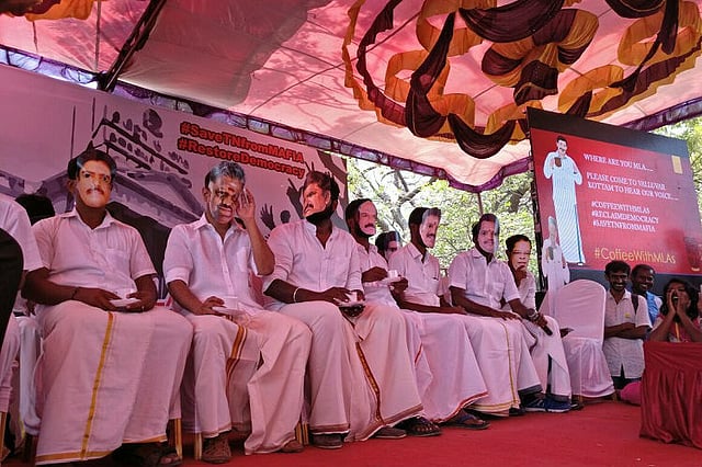 The event on Sunday morning was organised by Arappor Iyakkam, an anti-corruption group, with the help of students from across the city. The group had sent out invitations to the 122 MLAs who were lodged in resorts in Koovathur while the Sasikala vs OPS battle was raging.