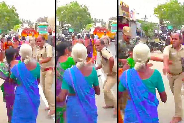 The video of the assault, played by Puthiya Thalaimurai, shows the police officer pushing the woman with his lathi, and then slapping her. The incident happened as women were marching on the road in Samalapuram, against a liquor shop being relocated to the area.