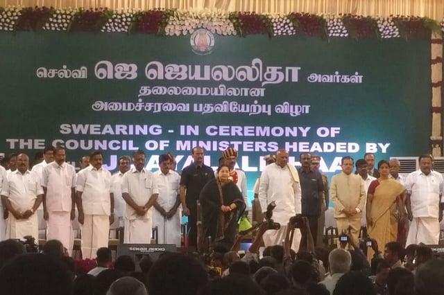 AIADMK general secretary and Tamil Nadu Chief Minister Jayalalithaa was sworn in for the sixth time at Madras University's Centenary Hall on Monday. The swearing-in ceremony started at noon with Governor K Rosiah administering the oath of office and oath of secrecy to Jayalalithaa at 12:05pm. This is the second time in 32 years that an incumbent Chief Minister is being sworn in for a consecutive term, with Jayalaluthaa emulating the feat of her mentor and AIADMK founder MG Ramachandran.