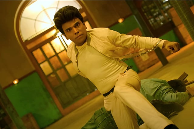 At the intermission scene, predictably, a grand tragedy has occurred; a setback in the hero’s path. No one is surprised. Post interval too, every ‘twist’ is hackneyed. Every passing minute escalates its cringe elements. Is something sad happening? It rains on cue. Does someone develop amnesia and recover at a pivotal moment? Indeed they do. Are there evil henchmen in weird masks slithering down ropes to kill the hero? Of course. Does the story suddenly jump from rural Tamil Nadu to somewhere-in-snow-covered Himalayas, with the barest of explanations? You already know the answer. At some point, you’re wondering if directors JD-Jerry, best known for Ullaasam, are trolling the audience or the business-empire-princeling-turned-hopeful actor. Possibly both.