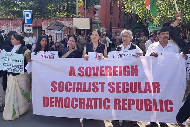 Advocates from opposition parties as well as those not linked to any political party were also present for the human chain to extend their support for the cause. The demonstration began around 10.30 am and the Preamble was read by 11.20 am. The lawyers then dispersed from the venue at 11.45 am. No slogans were raised in the premises of the Madras High Court.