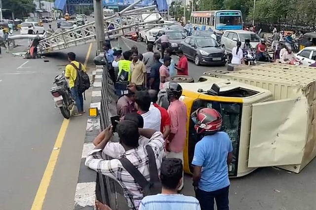 The signboard, which was approximately at a 30-feet height and gives directions to commuters from Tambaram, fell on the man’s two-wheeler, a mini-truck and an auto rickshaw. The windscreen of the Metropolitan Transport Corporation (MTC) bus was damaged completely but no injuries reported from the passengers. However, In the accident, three people were injured. Two of them — Shanumugasundaram, the two-wheeler rider who hailed from Pudukottai, and Stephen from Pallavaram — were rushed to the Government Royapettah Hospital where they received treatment for their injuries. However, Shanmugasundaram passed away on Monday morning.
