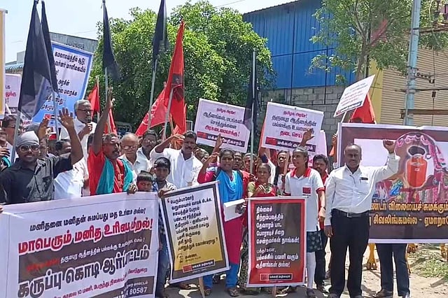 Activists protesting against the Pattina Pravesam event to be held at Dharmapuram Adheenam mutt in Mayiladuthurai were arrested by the police on Sunday, May 22. The protests were carried out ahead of the controversial Hindu ritual of Pattina Pravesam — the practice of carrying a seer in a palanquin procession, which is scheduled for Sunday evening. Members of Makkal Adhikaram, an organisation based in Tamil Nadu, led the protest which was held near Vijaya Theatres in Mayiladuthurai. Members of Viduthalai Chiruthaigal Katchi (VCK) and other parties also participated in the protest.