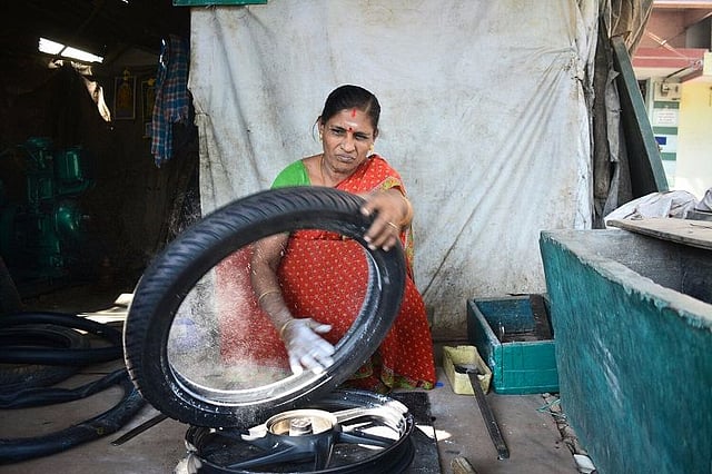 Untouched by the pomp and fanfare of the women’s day celebrations elsewhere, Latha is busy looking at the punctured tyre of a bike that has left its owner stranded.