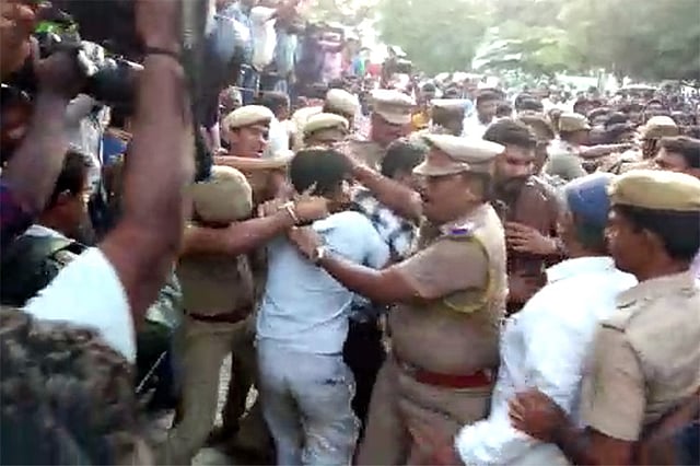 A large group of protestors gathered around the Government Hospital in Mettupalayam, raising slogans and pressing for their demands. Visuals from the spot show the police and the crowd trying to discuss something initially. However, the situation deteriorates rapidly and the police resort to manhandling the protestors and at one point, pushing one of them down and almost stamping on him. The chaos between the protestors and the police lasted for a few minutes, in which the police arrested around 25 persons who were allegedly leading the protests including Nagai Thiruvalluvan of the Tamil Tigers and Venmani of the Dravidar Tamilar Katchi. FIR has been registered under sections 143 [Unlawful assembly], 341 [Wrongful restraint], 353 [Assault or criminal force to deter public servant from discharge of his duty], 506(2) [Criminal intimidation] of the IPC.