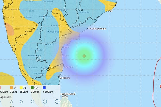 According to the National Center for Seismology, the epicentre was 296 km south-southeast of Kakinada in Andhra, 312 km south-southeast of Rajamundry, 339 km south-east of Guntur and 386 km east-northeast of Tirupati. In Tamil Nadu, the epicentre was located 320 km east north-east of Chennai.