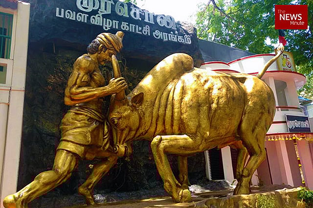 The first sight the exhibition offers is a larger than life statue of a man tackling a bull, in a pose that has for decades been associated to the 'veeravalaiyaatu', Jallikattu, which is the paper’s logo.