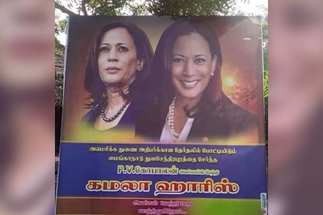 The poster with Kamala Harris' photo reads, "The people of Painganatu Thulasendrapuram wish Kamala Harris, PV Gopalan's granddaughter, victory in the US elections, where she's contesting for post of Vice President."