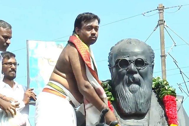Ranganathan believes that Periyar is the reason that he is able to live with self-respect. “I was able to study in the archaka training school because of him and go as far as the inner sanctum of the temple and perform pujas,” Ranganathan says. Although he disagrees with Periyar’s atheism and rejection of God, he believes that his ideas have helped him understand caste discrimination better. He adds, “If Periyar had not existed, I would still be treated as inferior to Brahmin priests because of my caste and would not have been able to train to be an archaka. We have come this far only because of the struggles of anti-caste leaders like Periyar and Ambedkar. Now, it is my duty to take their legacy forward.”