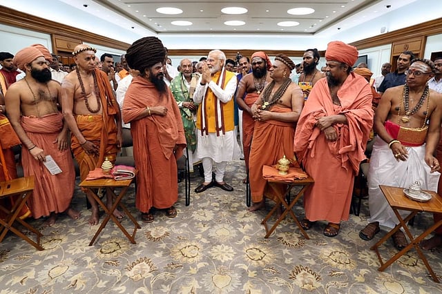 A day before the inauguration of the new Parliament building on May 28, a photo of the Thiruvavaduthurai Adheenam head seated in a chartered plane on the way to New Delhi went viral. The image spawned both widespread curiosity and criticism. Why was a special plane arranged for an Adheenam head? Why was he given VVIP treatment when the President of India Droupadi Murmu was not invited to the inauguration? These were the questions raised by many. Soon, a photo of the Adheenam heads standing beside Prime Minister Narenadra Modi with the sengol also grabbed attention, sparking curiosity about who the men in saffron robes are. Until the inaugural event, surely only a few outside Tamil Nadu would have heard about this particular Saivite sect.