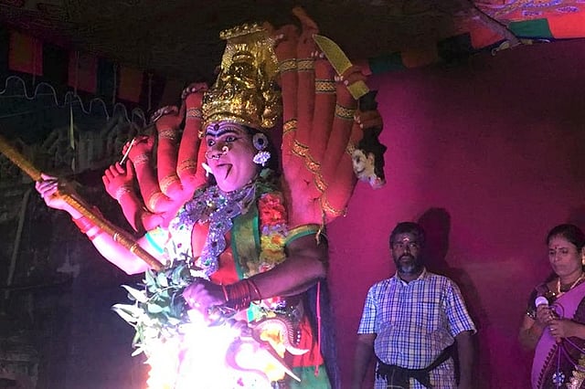 A wave of palpable excitement sweeps a busy street at Sellur in Madurai as Stella readies to make that grand entry. The small crowd, consisting mostly of young men and women, are momentarily taken aback when she soon appears, her make-up as Kali intact, in red sari and six pairs of hands. Carrying a brass plate with a burning camphor in one hand and a bunch of neem leaves in the other, Stella carefully negotiates her dance steps, yet not compromising on the fury of movements and expressions typical of Kali.
