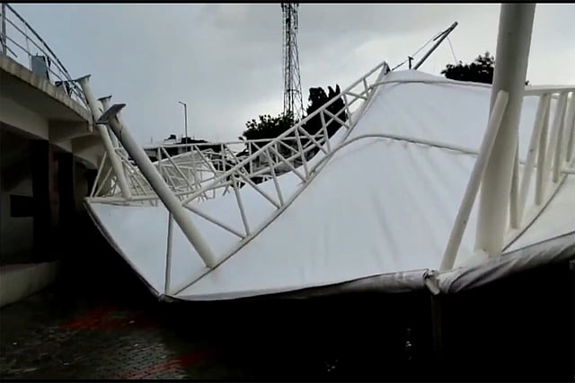 A part of the tensile roofing of the VOC Stadium in Tamil Nadu’s Tirunelveli, inaugurated eight months ago, collapsed after 30 minutes of heavy rain on Monday, May 22. Casualties were avoided as there was no public activity in the stadium at the time of the collapse. The city corporation issued a notice directing the contractor who undertook the roofing work to bear all the expenses of the repairs.