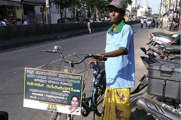 38-year-old Narmada Nandakumar has to begin her day early, before the scorching sun zaps out all her energy. Sporting a dull grey cap, Narmada climbs onto her bicycle to begin her day’s campaign. This school teacher from Chennai is the newly-formed Puthiya Sakthi Front’s (PSF) candidate for Ambattur.