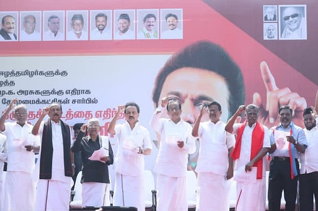 Tamil Nadu Opposition leader Stalin led the peaceful rally and leaders of alliance parties, walked alongside him holding placards against the contentious Citizenship (Amendment) Act. Cadres of DMK and other allies including MDMK, INC and VCK, holding party flags, banners and placards, marched on as the procession, taken out amid tight security and deployment of drones for monitoring, wound its way from downtown Egmore to Rajarathinam stadium, a distance of about 2.5 km.