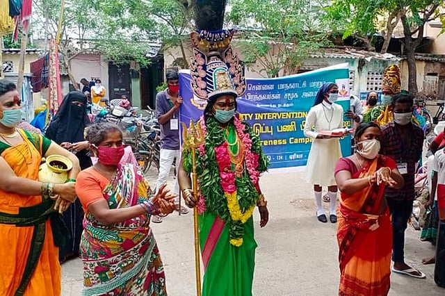 In collaboration with the Chennai Corporation and Rotary club, Swetha has conducted many street plays to bolster awareness, especially in slum areas about the coronavirus and precautions against it. "You can see a trans woman dressed as an air hostess miming the announcements which are about enforcing the use of masks, washing hands, drinking immunity boosters and maintaining physical distancing. We also conduct a dance programme for songs that talk about similar things. We conduct general street plays with masks and sanitisers as properties of the play," said Swetha. “Since July was the month of Aadi, we dressed up as goddess Amman and spoke like her to promote precautionary measures.”