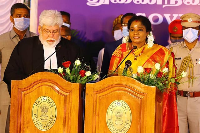 Telangana Governor Tamilisai Soundararajan, who was given additional charge of Puducherry, was sworn in as Lt Governor of the Union Territory on Thursday.