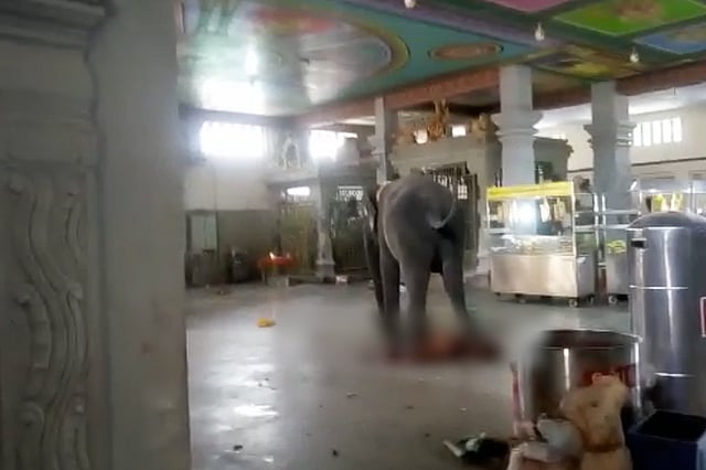 In visuals that emerged moments after the incident, Masini could be seen repeatedly stamping the lifeless body of the mahout, moving around in circles within the main temple premises and dragging the mahout's body from side to side. A person can be trying to retrieve the body from underneath the elephant.