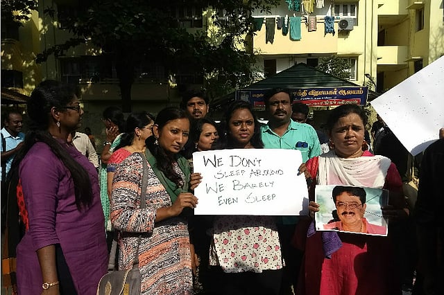 The protesters were repeatedly told by the police to move to the side of the road. Faced with scant space and stubborn police officers, the journalists decided to take the protest to S Ve Shekher's house in Mandaveli.
