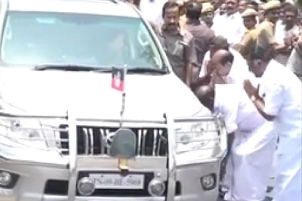 Leaders prostrating or taking Amma's blessings is nothing new in Tamil Nadu, but what is strange is that the AIADMK supremo Jayalalithaa is seated in a car, and the leaders are seen touching the ground standing beside the car.