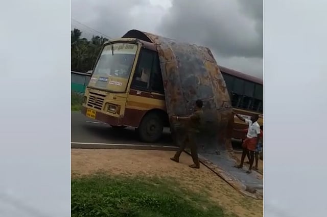 A video of a state-run bus in Tamil Nadu with its roof coming apart has gone viral on social media. The video footage captured from the spot shows a Tamil Nadu State Transport Corporation (TNSTC)-owned bus (Registration number TN 38 N2769) parked on the side of a road. A sheet of metal – the roof of the bus – is being pulled by the conductor and the driver, as other watch on.