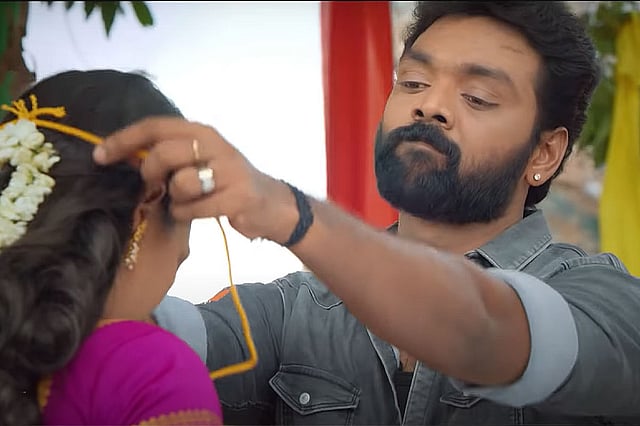 Shortly after Abhinaya offers her prayers inside the temple, we see the male protagonist, a thug, locking horns with a newly-wed couple for getting married without their parents’ ‘permission and blessings’. “Is this a marriage or a robbery”, he shouts. He even goes on to break off their marriage by snatching the woman’s thaali (mangalsutra). At this point, Abhinaya intervenes and points out how the couple got married in front of the temple deity. She slaps the male lead and questions how he is entitled to nullify the couple’s relationship.