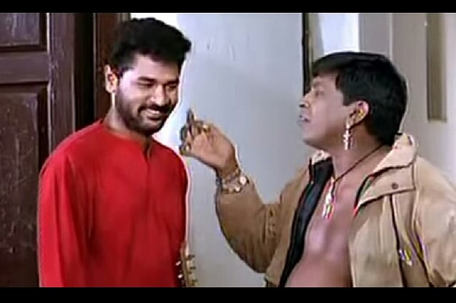 Prabhu Deva is known for his dance skills and comic timing. In Manadhai Thirudivittai, a regressive college romance, he appears with Vadivelu in a comedy sequence that has achieved immortality in Tamil popular culture.