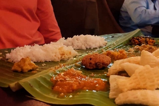 The dining hall is a large, well-air conditioned space with seating for about 150 diners, and we were ushered to a table for four that we shared with two strangers - a typical meals-hotel scenario. The feast then began with the laying of the banana leaf before us. We were served sweets first, a trio spearheaded by the venerable boore (pronounced boo-ray, plural boo-ray-lu - very important as you will want to ask for several of them at one go). Now this is a sweet that looks deceptively like a potato bonda - except that inside, instead of the potato is a sweet filling that is without a doubt stolen from the kitchens of the gods and smuggled into East Godavari. It is called poornam in Tamil, and Sathyan tells me the same sweet is called susiyam in Trichy and Madurai and I have no reason to doubt him.