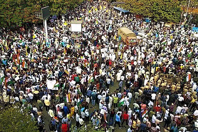 A common thread connected the slogans heard at Hyderabad’s Dharna Chowk on Saturday, where thousands of people turned up to march against the Citizenship Amendment Act (CAA). The slogans all called for unity among different religions in India — with the loudest being the popular slogan from university campuses — “Awaaz do” (Say it out loud), with the crowd responding in unison, “Hum ek hai (we are one).” Protesters were also calling for religious unity with a dig at the ruling party at the Centre, “Hindu Muslim bhai bhai, Modi-Shah hai hai.”