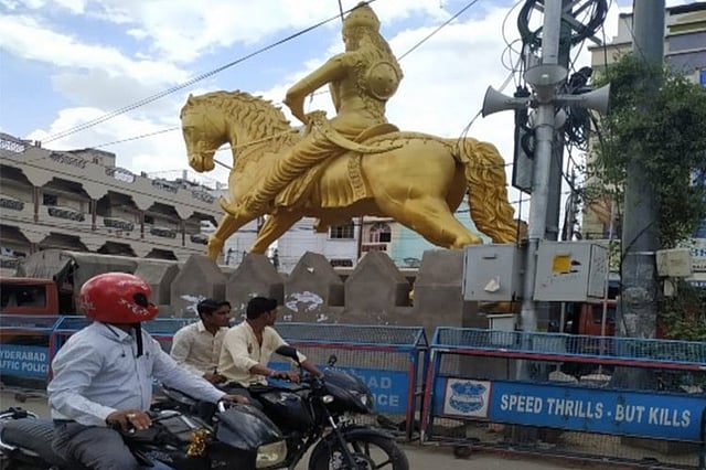 When the people of Goshamahal woke up on Thursday morning, a new resident had established presence at the Jumeraat Bazaar in Hyderabad’s Old City area — a 25-feet tall reinforced fibre statue of Rani Avanti Bai Lodh, a freedom fighter. The gold painted statue was the cynosure of all eyes, with passersby even stopping their vehicles to click a picture, or just simply stare at Rani Avanti Bai Lodh.