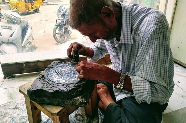 As we enter craftsman Khaleel’s workshop, one might want to check the name-board twice because the place looks very different from where we'd imagine the beautiful Bidri art pieces we see at pricey art exhibitions, are made. There are blackened art wares stacked on the shelves and a few artisans squatting on the floor, chiselling minute metal pieces. In contrast to the solemn picture inside the shop, its owner Khaleel Ahmed is happy and excited.