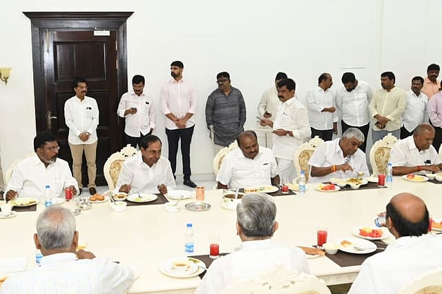 The leaders of JD(S) and VCK arrived in Hyderabad on the invitation of Telangana Rashtra Samithi (TRS) chief KCR, who is set to formally announce the launch of his national political party on the occasion of Dasara. KCR, TRS working president KT Rama Rao and others welcomed the guests at Pragati Bhavan and hosted breakfast for them. Ministers T Harish Rao, Prashanth Reddy, MP Santosh Kumar, several TRS MLAs, MLCs and other leaders were also present.