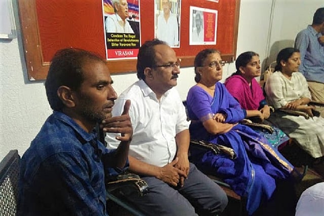 Kurmanath, whose house was also raided, told the gathering, “As usual, I went to walking at Indira park, when 6 to 7 people in civil clothes rounded me up and seized my phone. They took me in my car. The entire task was carried at 2 am, I could understand their language. They just did the raid at 6 am. Apart from seizing my phone and cutting my landline, they seized my laptop which had all my children's photos. I don't even have a copy of it. The Telangana police also aided them in this atrocity. When police asked me about a book, I told them that it was a book about a Telangana martyr. But, the Telangana police said to them that the book was that of a Maoist."
