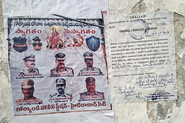 The Golconda police was fined Rs 10,000 after the GHMC came across these posters welcoming the general public for Bonalu festivities at the temple in Golconda fort, which began this week.