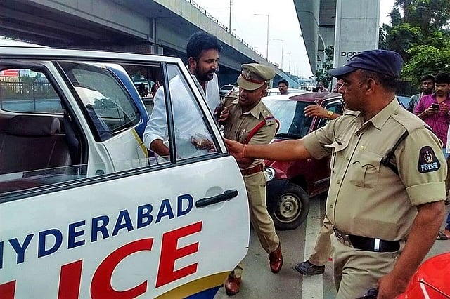 The Congress workers were led by the TPCC official spokesperson, M Krishank, who protested the Telangana's recent decision to acquire land for a proposed flyover under the Strategic Road Development Programme (SRDP).