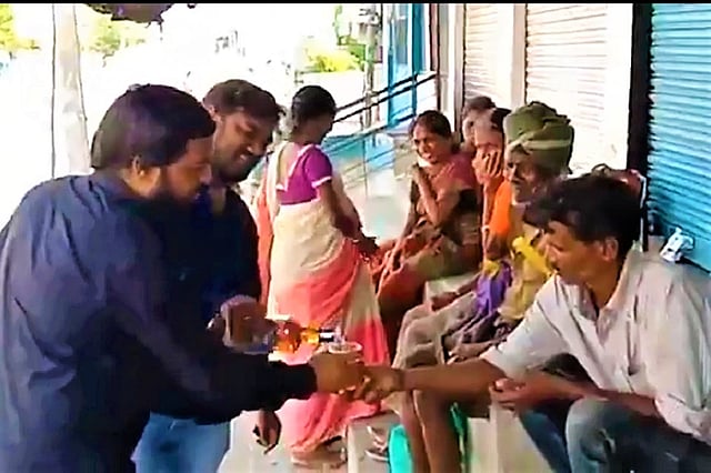 Man distributes free alcohol to labourers (one-peg each) in Hyderabad who desperately needed it. He had some stock left with him and tried to help out people who can't sustain without alcohol. Good or bad? pic.twitter.com/Z91XkwRVr9