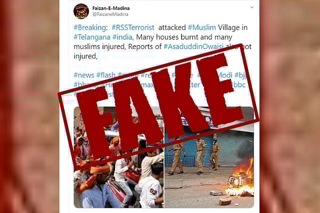 "#Breaking: #RSSTerrorist attacked #Muslim Village in #Telangana #india, Many houses burnt and many muslims injured, Reports of #AsaduddinOwaisi also got injured (sic)," the tweet said, attaching two images. While one image showed several young men carrying saffron flags, the other showed police personnel walking in the background, behind a burning bike.