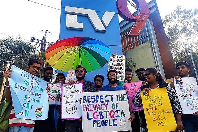 LGBTQI+ activists gathered outside the office of TV9 Telugu on Thursday evening, to protest a recent story aired by the channel, with homophobic content. Those gathered for 'Queering TV9' included members of the Hyderabad Queer Swabhimana Yatra, Queer Campus Hyderabad and Mobbera.