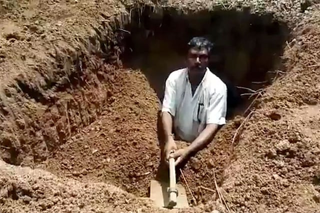 A farmer from Narsimhulupet in Telangana’s Mahabubabad district dug a grave and attempted to bury himself in protest after he was allegedly denied land documents by the tehsildar. He was rescued by onlookers.